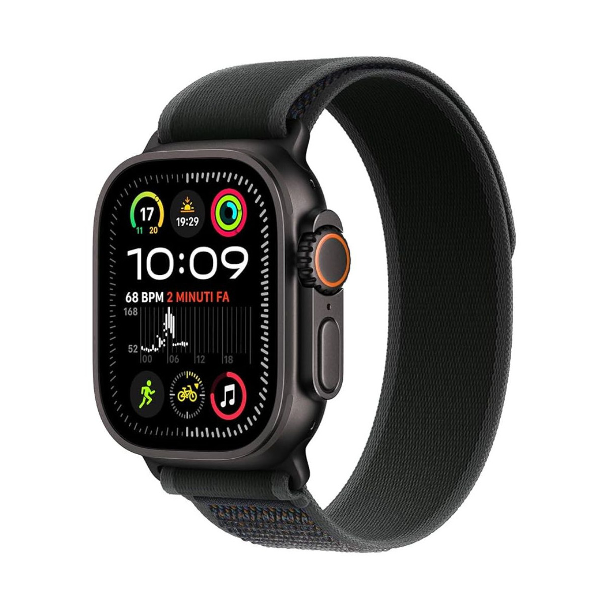 Design e materiali:Cassa: Realizzata in titanio (grado 5), un materiale leggero e resistente, in questo caso nella finitura "nero titanio". Le dimensioni della cassa sono di 49 mm, rendendolo il modello più grande della gamma Apple Watch. Il design include bordi rialzati per proteggere il display da urti accidentali.Display: Il display è un Always-On Retina LTPO OLED con cristallo di zaffiro piatto, noto per la sua eccezionale resistenza. Ha una luminosità massima di 3000 nit, la più alta mai vista su un Apple Watch, che garantisce una leggibilità perfetta anche sotto la luce diretta del sole.Cinturino: Il Trail Loop nero è un cinturino leggero e sottile, progettato per il comfort e la versatilità. È realizzato in nylon intrecciato con un'innovativa linguetta per una regolazione rapida e semplice, ideale per gli allenamenti o l'uso quotidiano.Funzionalità e prestazioni:Connettività: Questo modello include sia il GPS che la connettività cellulare (4G). Questo significa che puoi effettuare chiamate, inviare messaggi, ascoltare musica in streaming e utilizzare le app senza dover avere l'iPhone con te. La connettività 4G è attiva tramite eSIM. Il GPS è di precisione a doppia frequenza (L1+L5), per un tracciamento dei percorsi estremamente accurato.Processore: L'Apple Watch Ultra 2 è dotato del chip S9 SiP, che include un processore dual-core a 64 bit e un Neural Engine a 4 core. Questo assicura prestazioni veloci e fluide e abilita nuove funzionalità basate sull'apprendimento automatico, come il "doppio tap".Autonomia: La batteria offre un'autonomia fino a 36 ore con un uso normale e fino a 72 ore in modalità Basso consumo, rendendolo adatto per avventure di più giorni.Resistenza: È un dispositivo estremamente robusto, progettato per resistere agli ambienti più difficili. Ha una resistenza all'acqua fino a 100 metri (certificazione EN13319 per immersioni amatoriali fino a 40 metri) e alla polvere di grado IP6X. Resiste a temperature estreme, altitudini elevate, e ha superato test secondo lo standard MIL-STD 810H.Funzionalità per la salute e il fitness: L'Ultra 2 include una vasta gamma di sensori e funzionalità per il monitoraggio della salute, tra cui:Cardiofrequenzimetro elettrico per l'ECG.Sensore per il monitoraggio dell'ossigeno nel sangue.Sensore di temperatura (con stime retrospettive dell'ovulazione per il monitoraggio del ciclo).Profondimetro e sensore della temperatura dell'acqua.Sirena per le emergenze.Rilevamento incidenti e cadute.Gesto "doppio tap" per interagire con l'orologio senza toccare il display.Software: Funziona con il sistema operativo watchOS, offrendo un'interfaccia intuitiva e l'accesso a un vasto ecosistema di app.