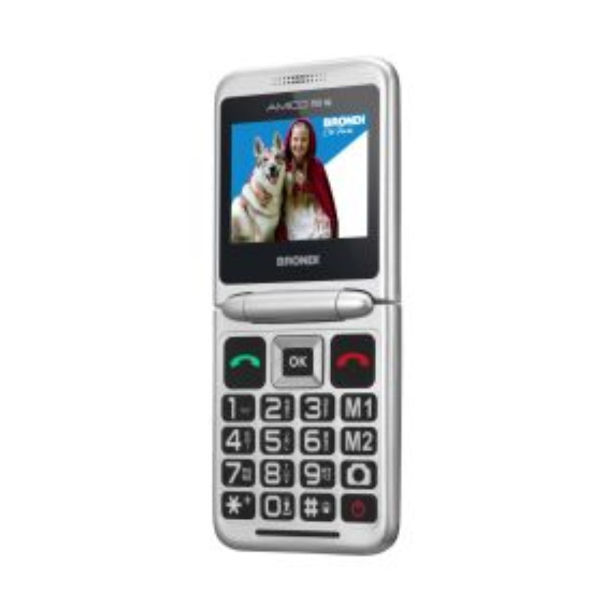 Il Brondi Amico Tuo 4G è un cellulare a conchiglia con supporto 4G, Dual SIM, tasti grandi, tasto SOS, e una base di ricarica inclusa.