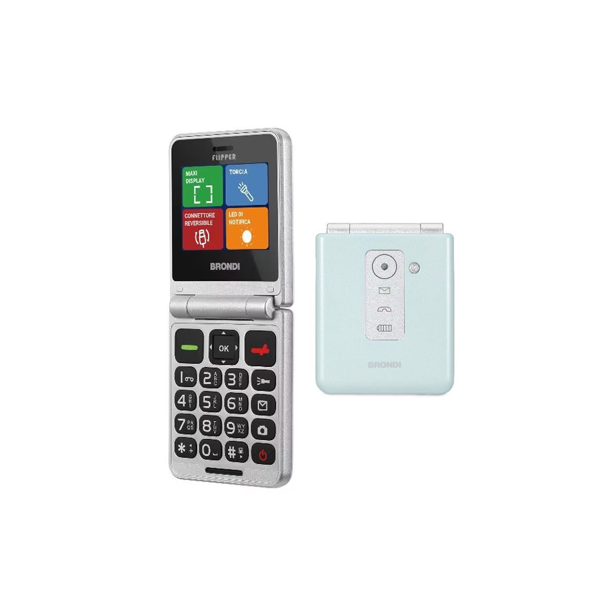 Brondi Flipper Duos Verde Acqua Metal Italia: Telefono cellulare Dual SIM con design a conchiglia (flip phone), colorazione verde acqua metallizzato, ideale per chi cerca semplicità e praticità.